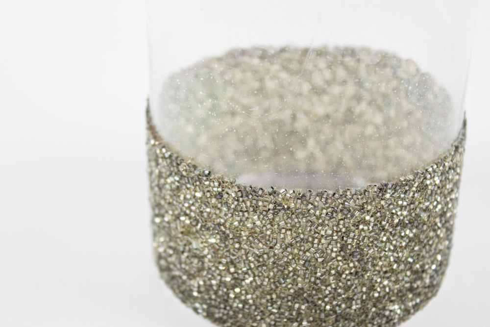 A gold hammered candle placed on top of a book, with a white decor item to its left and a glass vase with dried flowers in the background.