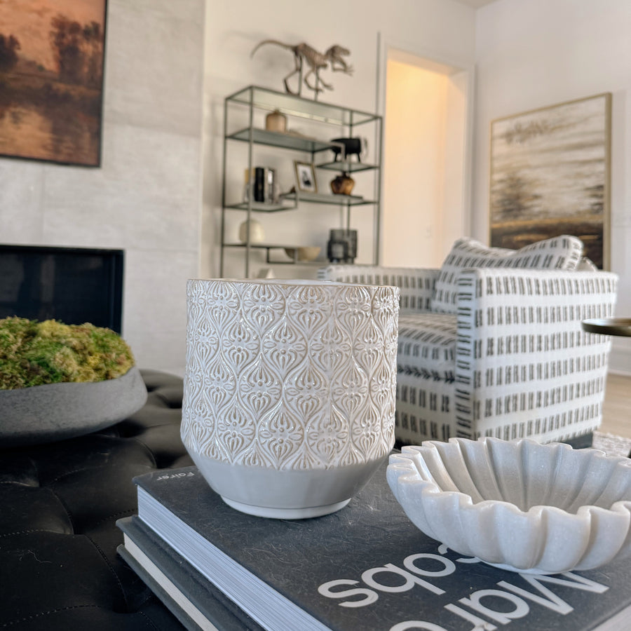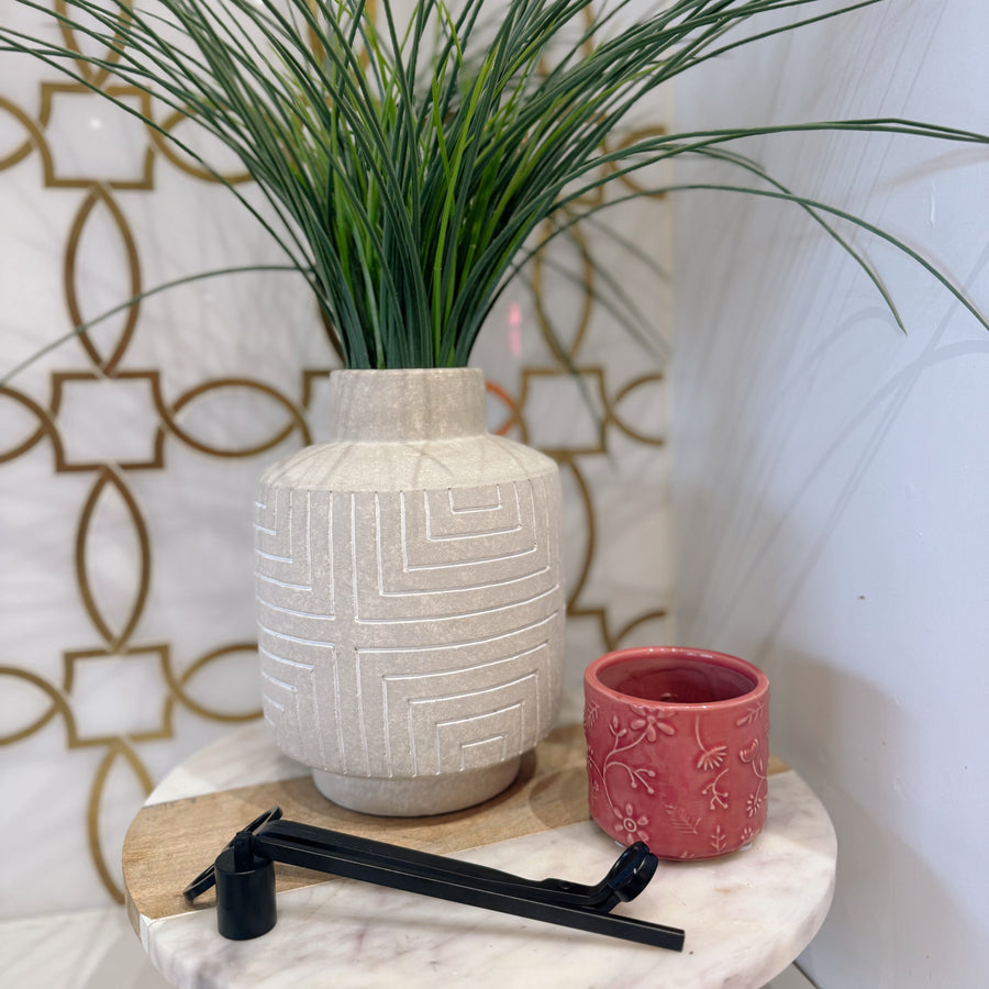 Decorative items including a vase with dried pampas grass and a white pumpkin-shaped candle on a gold tray.