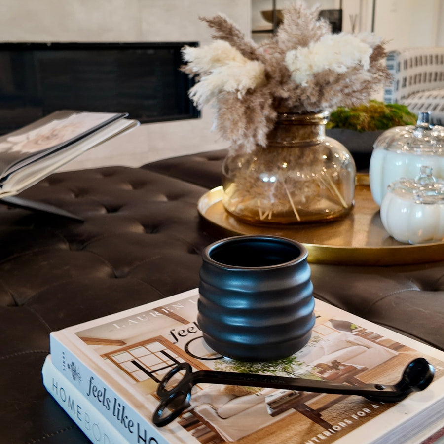 A large clear glass soy candle with a white label that reads 'Unplug', accompanied by a pair of black wicks and several wooden wicks on a table, with a decorative plant in the background.