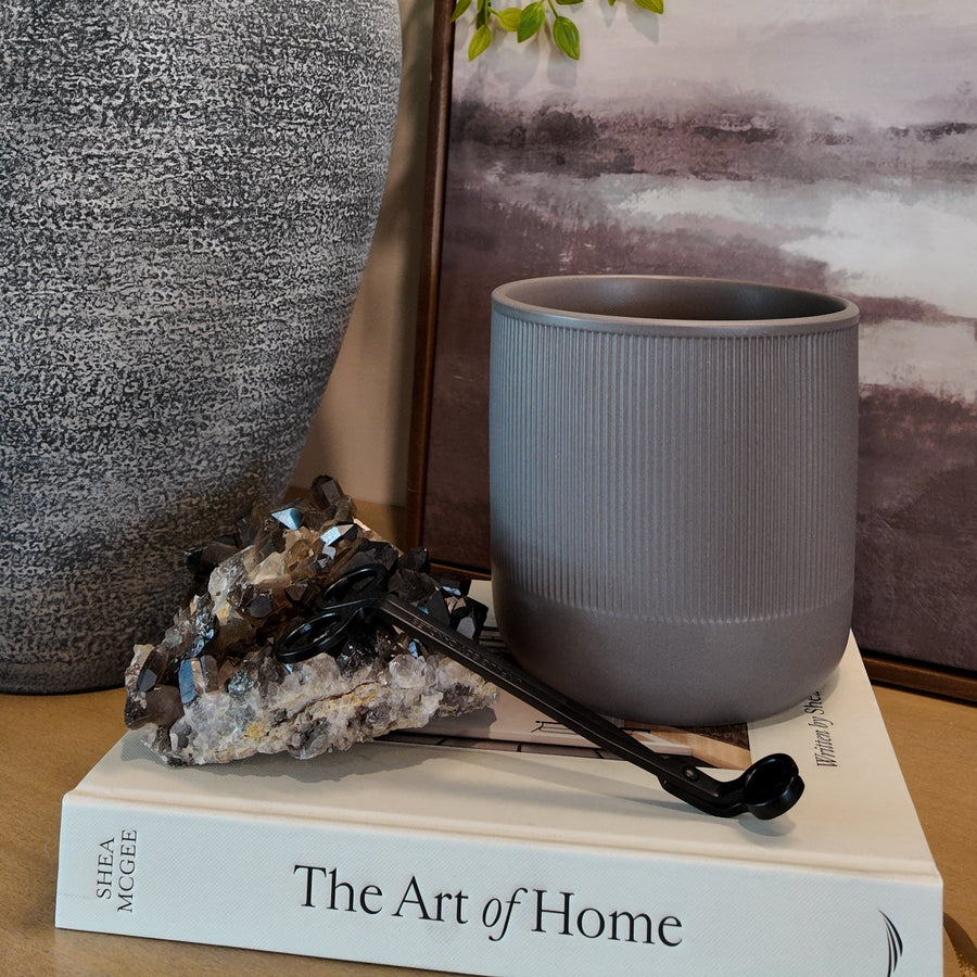 gray glass pumpkin vessel with a soy candle inside