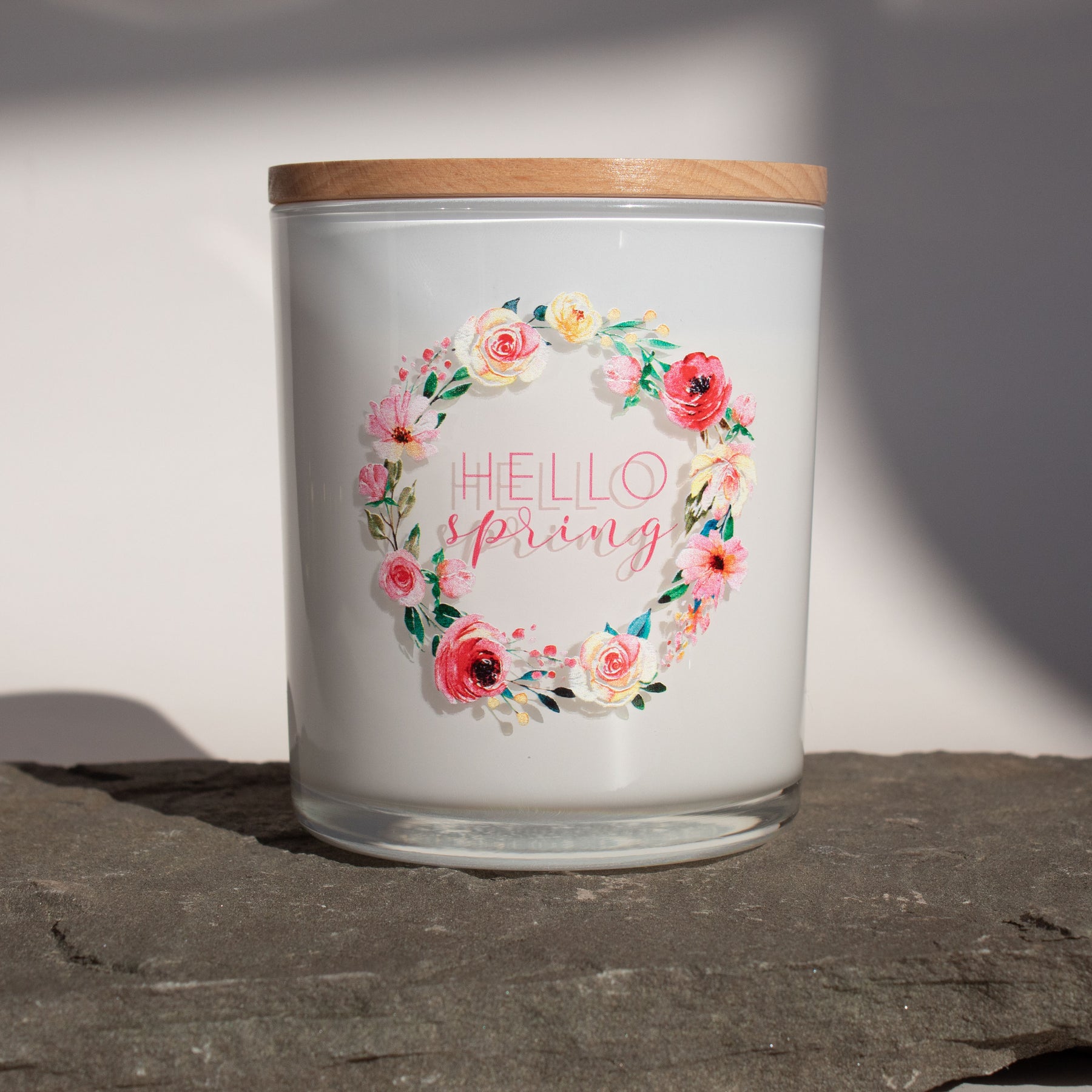 Hello Spring! Our Hello Spring candle features a beautiful floral wreath around the pink message. This candle is perfect for a gift or to keep for yourself.