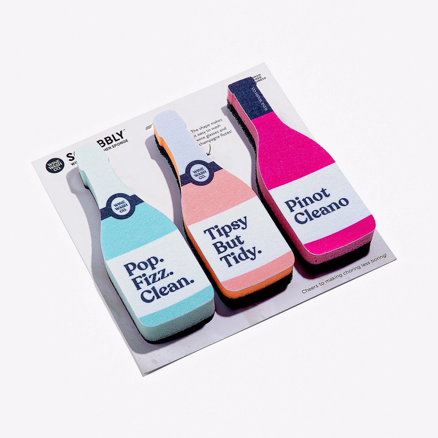 Our Scrubbly wine-shaped kitchen cleaning sponges are an easy way to add a pop of fun to your kitchen. They're great for light housework. The narrow neck makes it easy to clean inside wine glasses and champagne flutes.