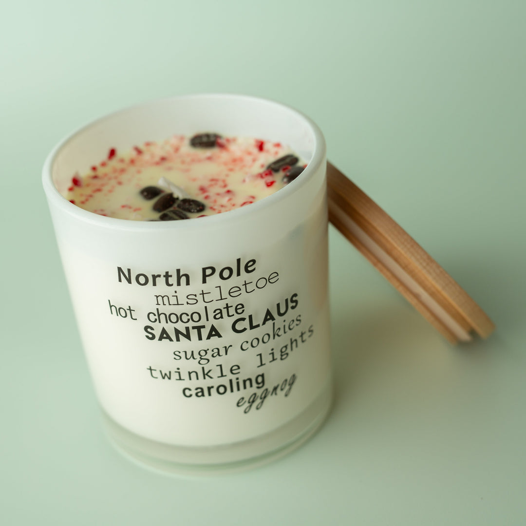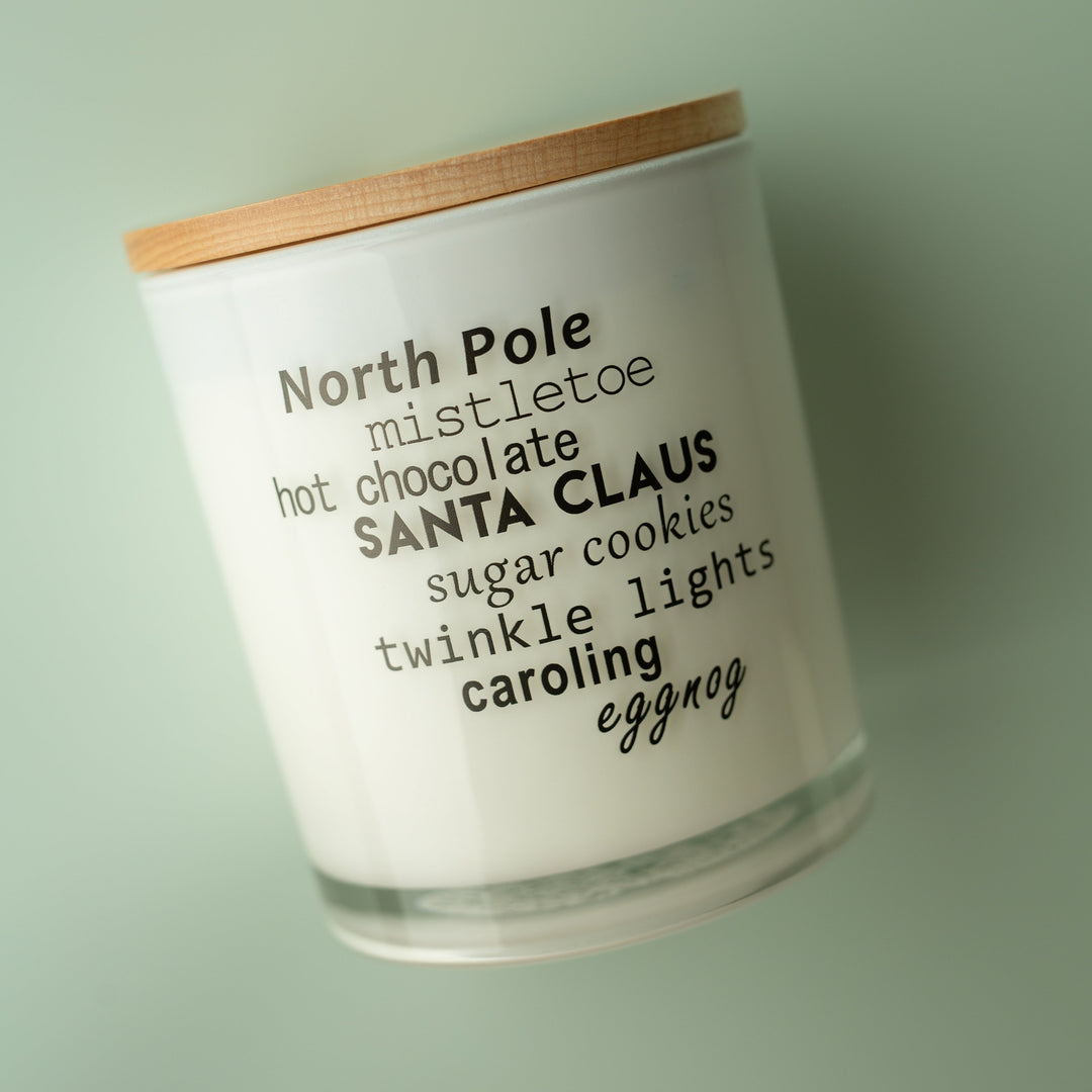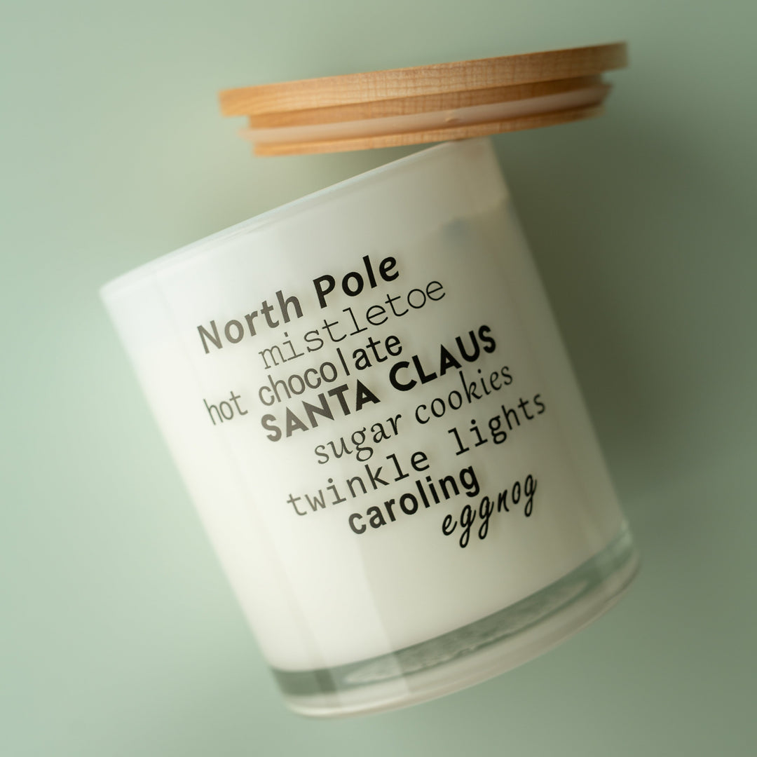 This candle reminds us of all of the things that we love about Christmas time. The print includes the words: the North Pole, mistletoe, hot chocolate, Santa Claus, sugar cookies, twinkle lights, caroling, and eggnog.