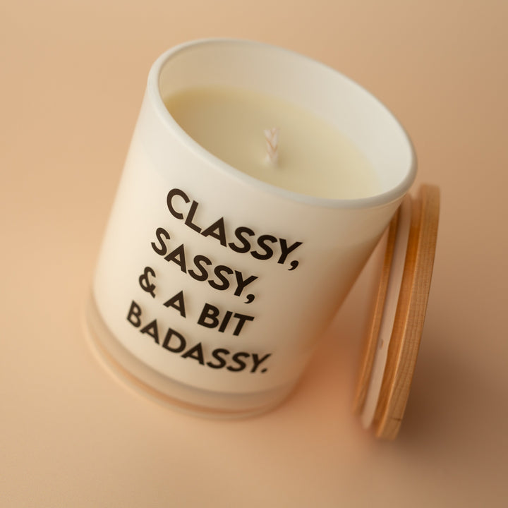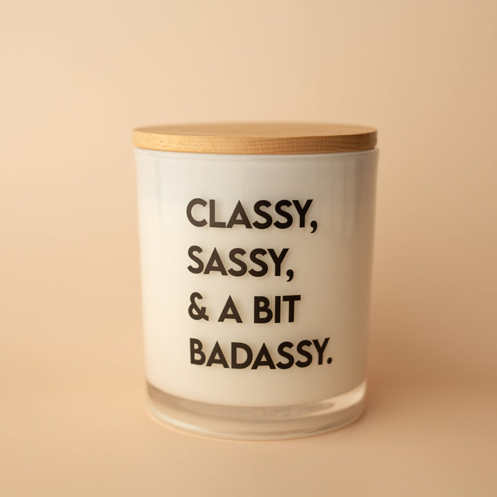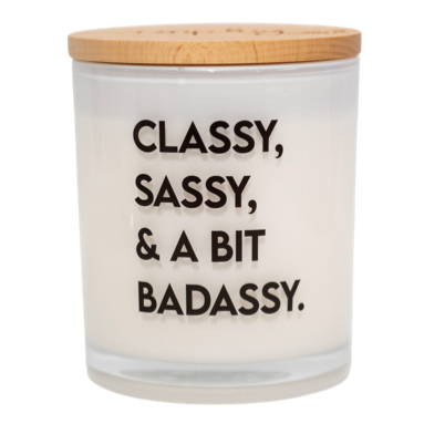 If you're looking for something to sum up yourself or a friend real quick, this candle will do the trick! This printed candle reads "Classy, sassy and a bit badassy."