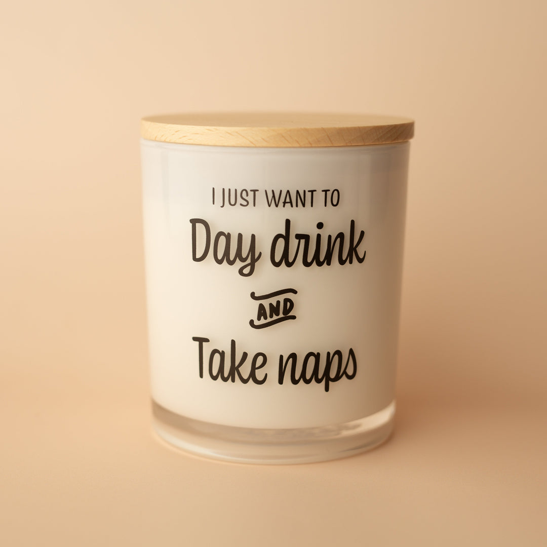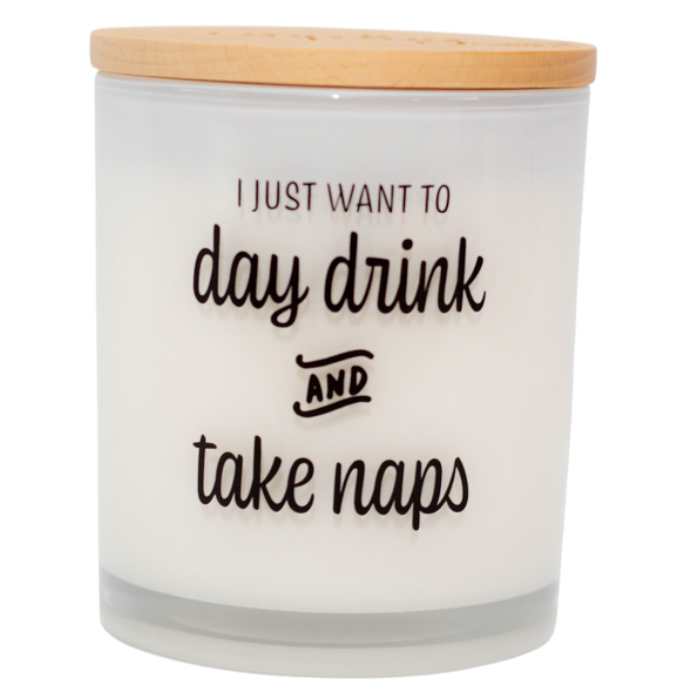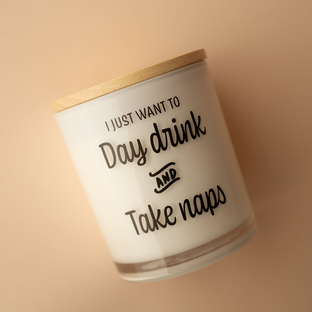 This printed candle reads "I just want to day drink and take naps" (the ultimate truth). This is the perfect printed candle for anybody who enjoys day drinking.