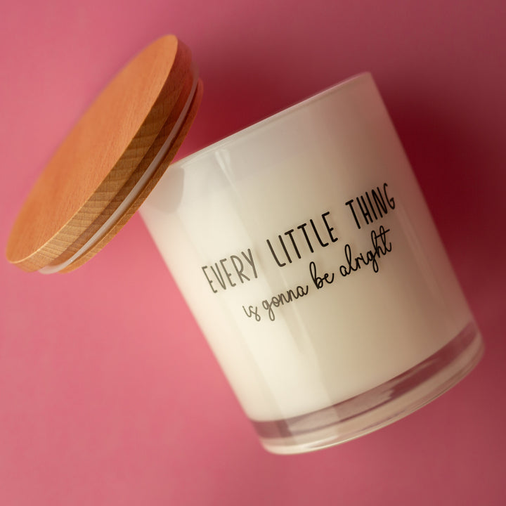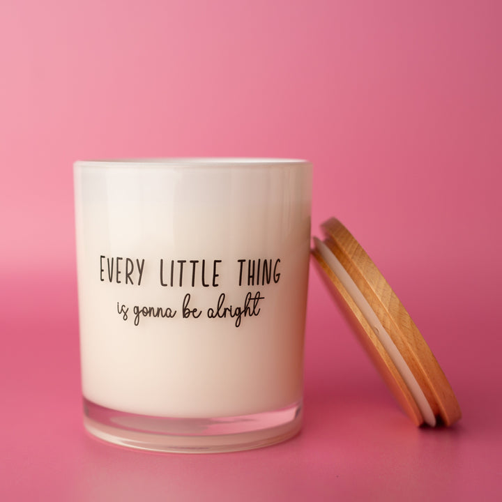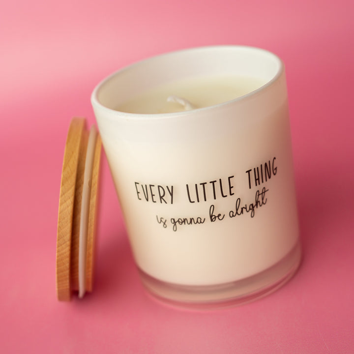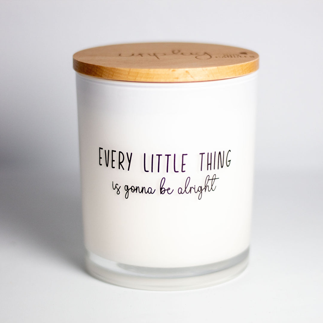 This printed candle reads "Every little thing is gonna be alright"