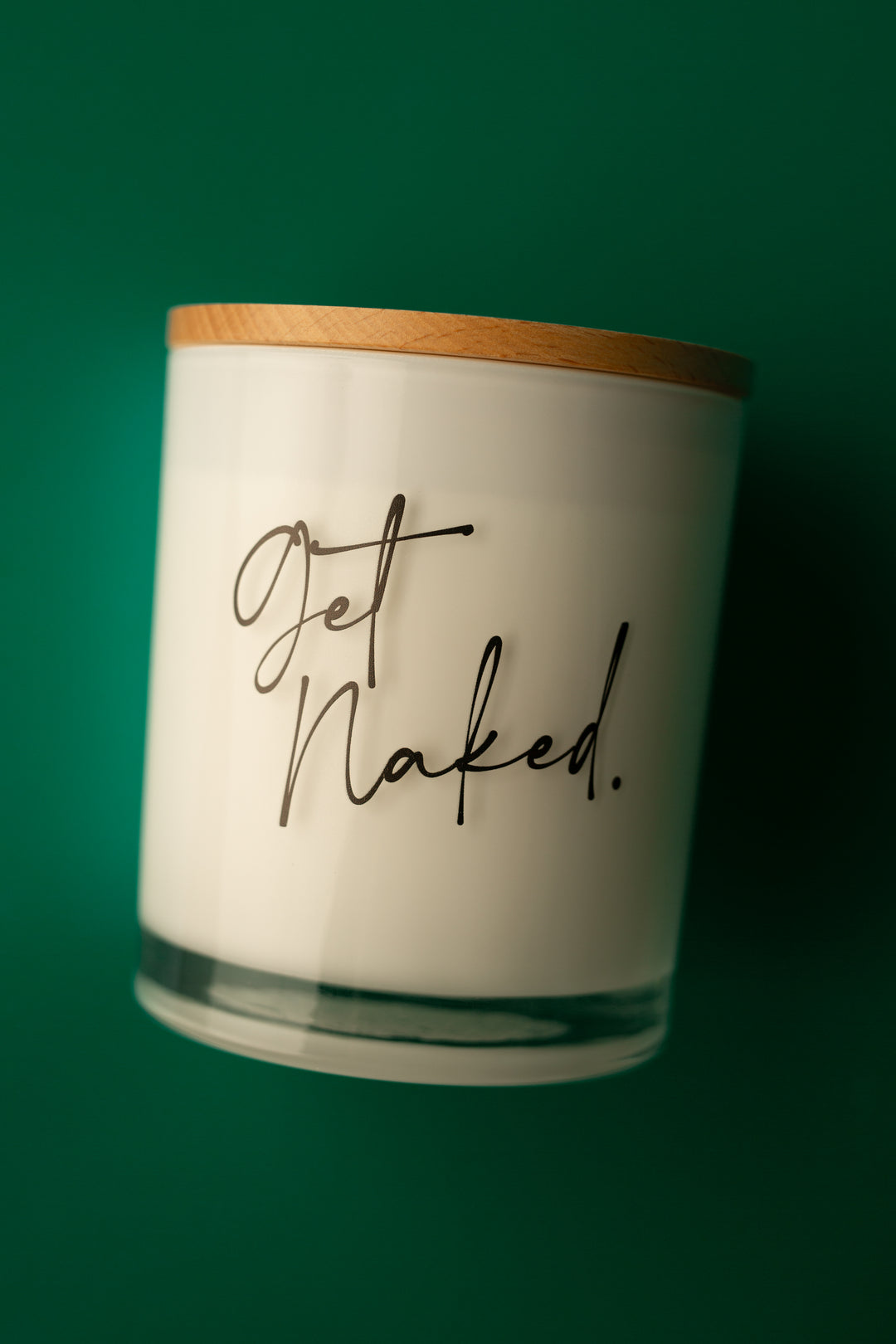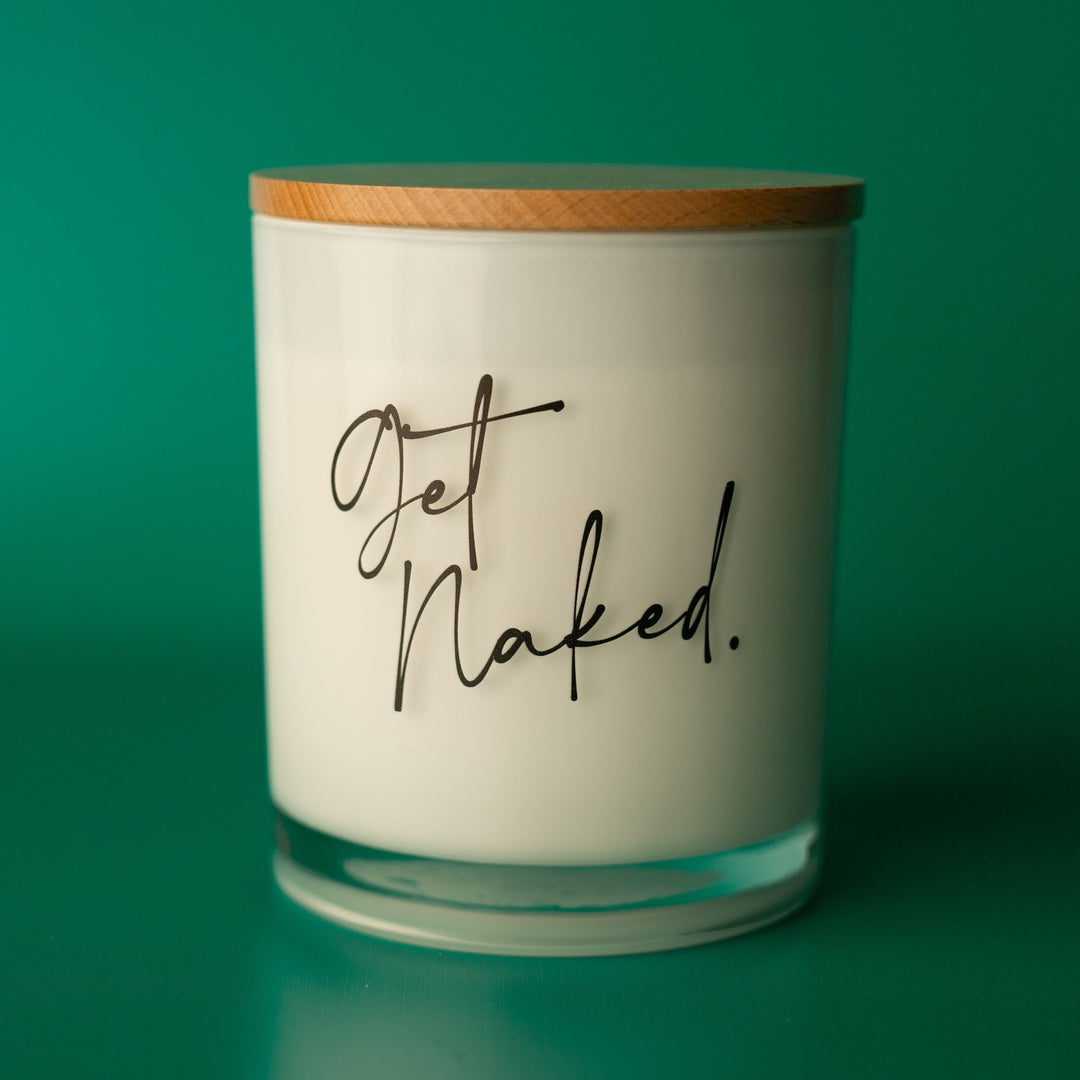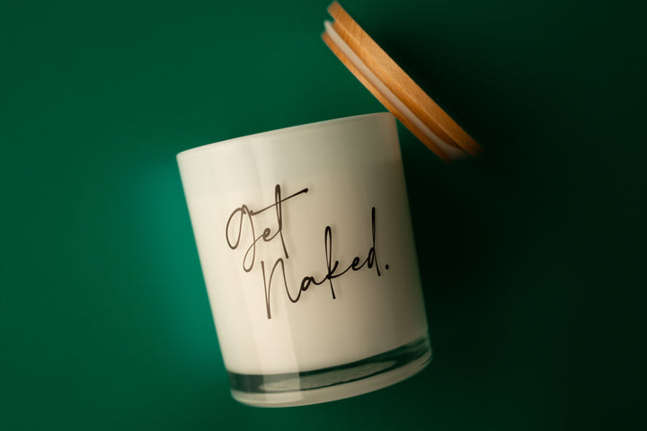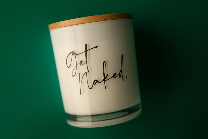 The perfect mix of scandalous and cute. This printed candle reads "get naked" in an elegant cursive font. Looking for the perfect bathroom candle? You've found it!
