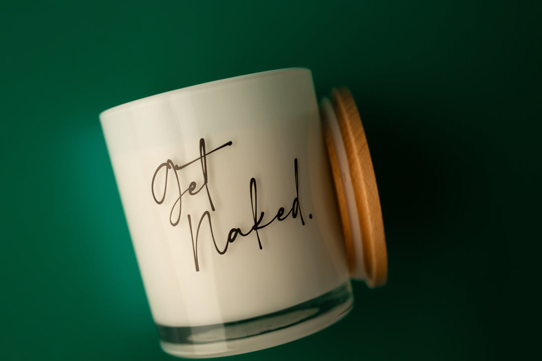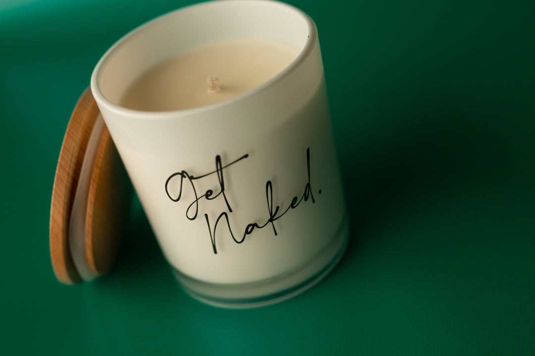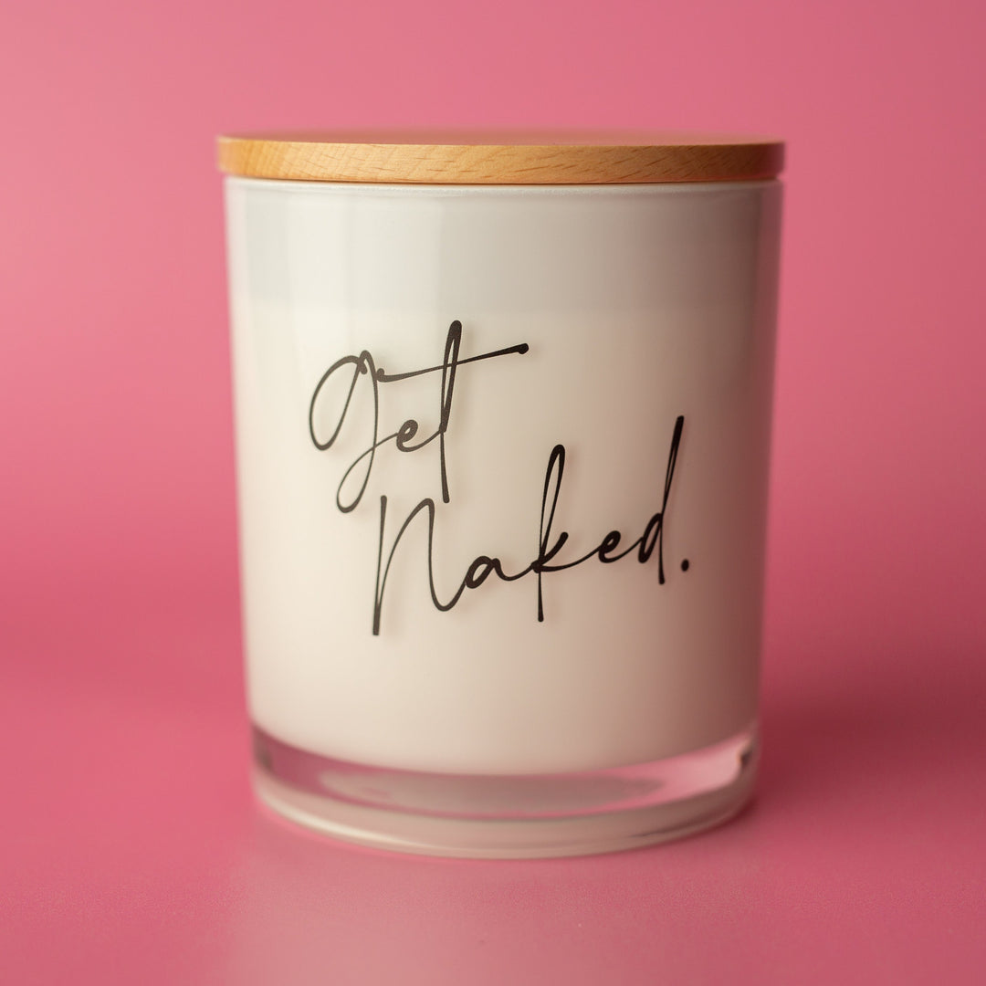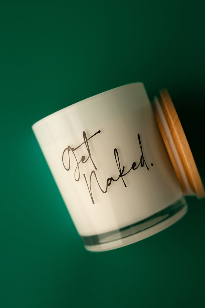 The perfect mix of scandalous and cute. This printed candle reads "get naked" in an elegant cursive font. Looking for the perfect bathroom candle? You've found it!