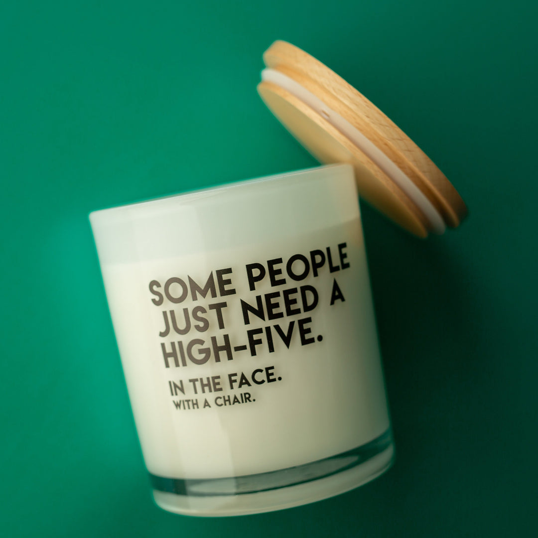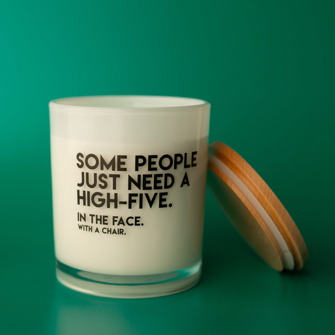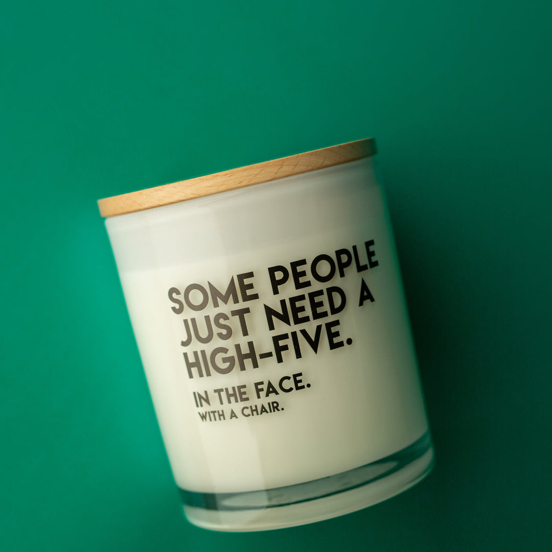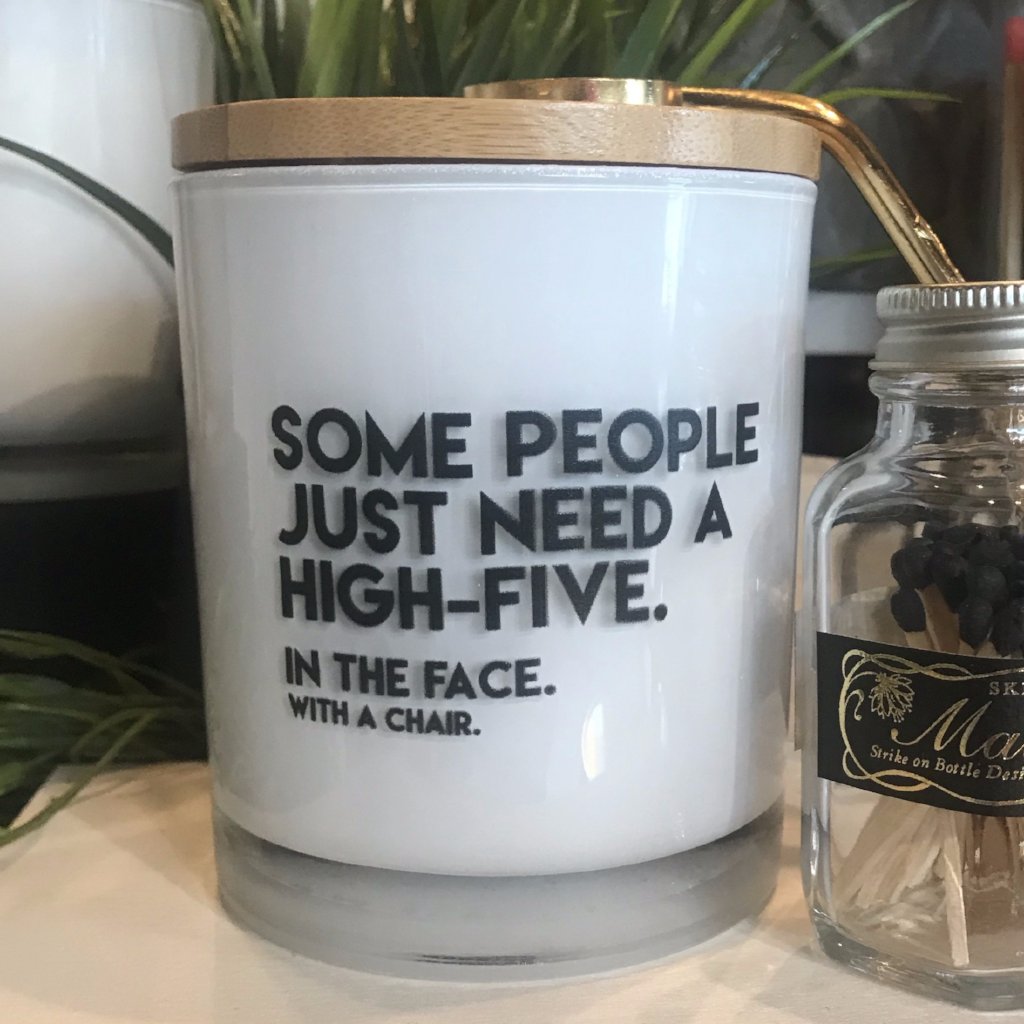 This printed candle reads "Some people just need a high-five. In the face. With a chair." Talk about the perfect candle for anyone with a saucy personality.