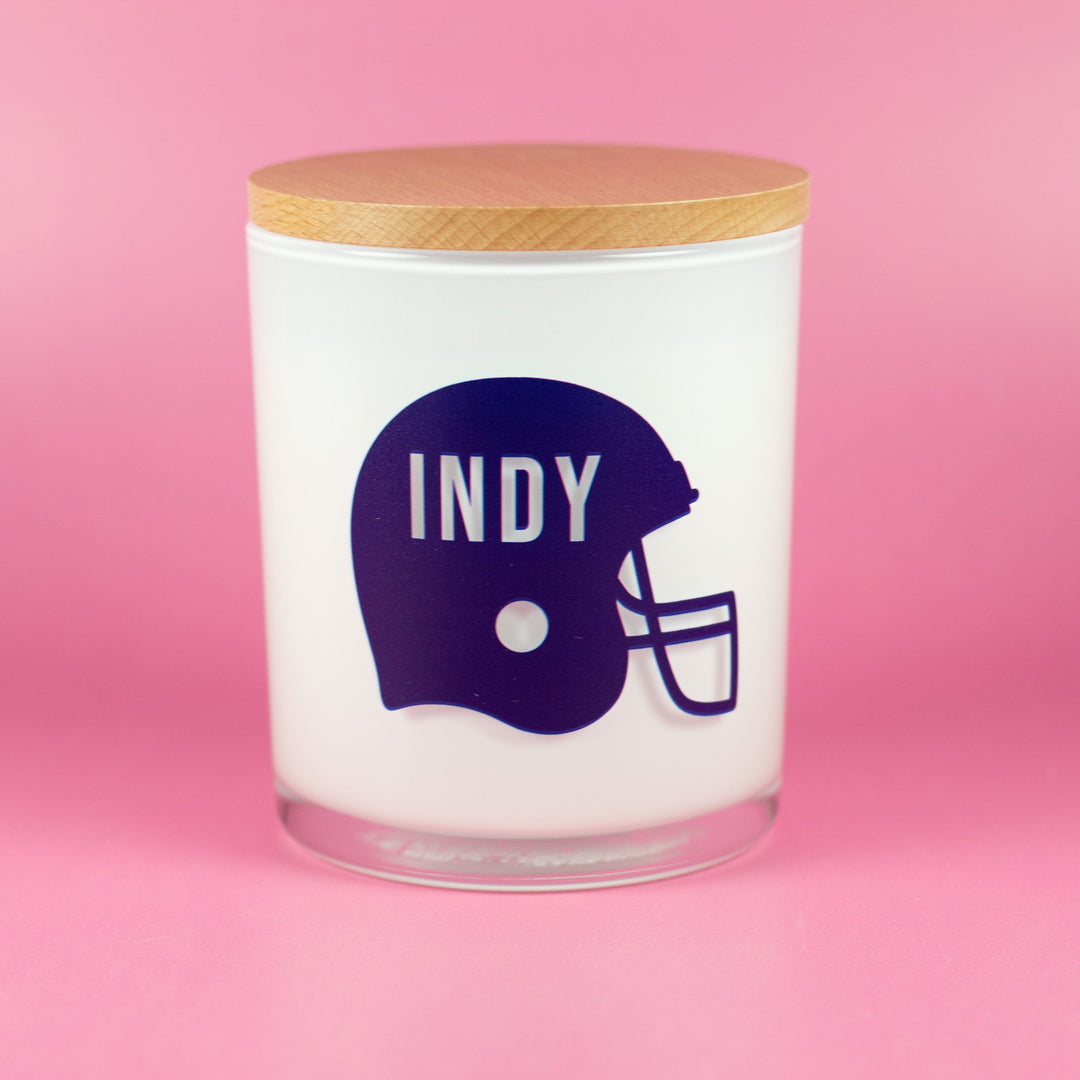 Show your support for the Indianapolis Colts with our Indy Helmet Candle! Featuring a bold design of a helmet emblazoned with 'INDY' in classic royal blue, this candle is the perfect tribute to your hometown team and football pride.