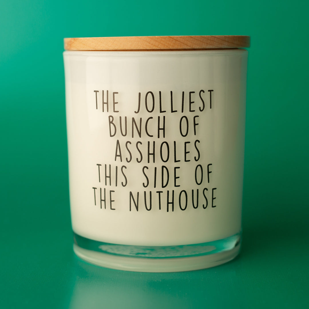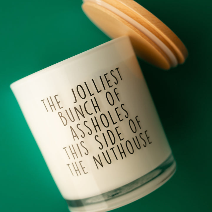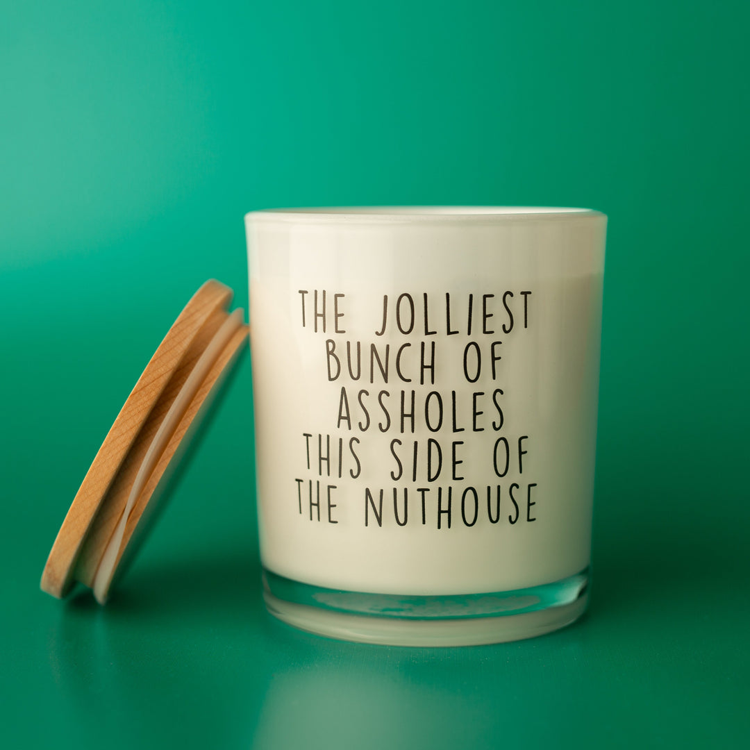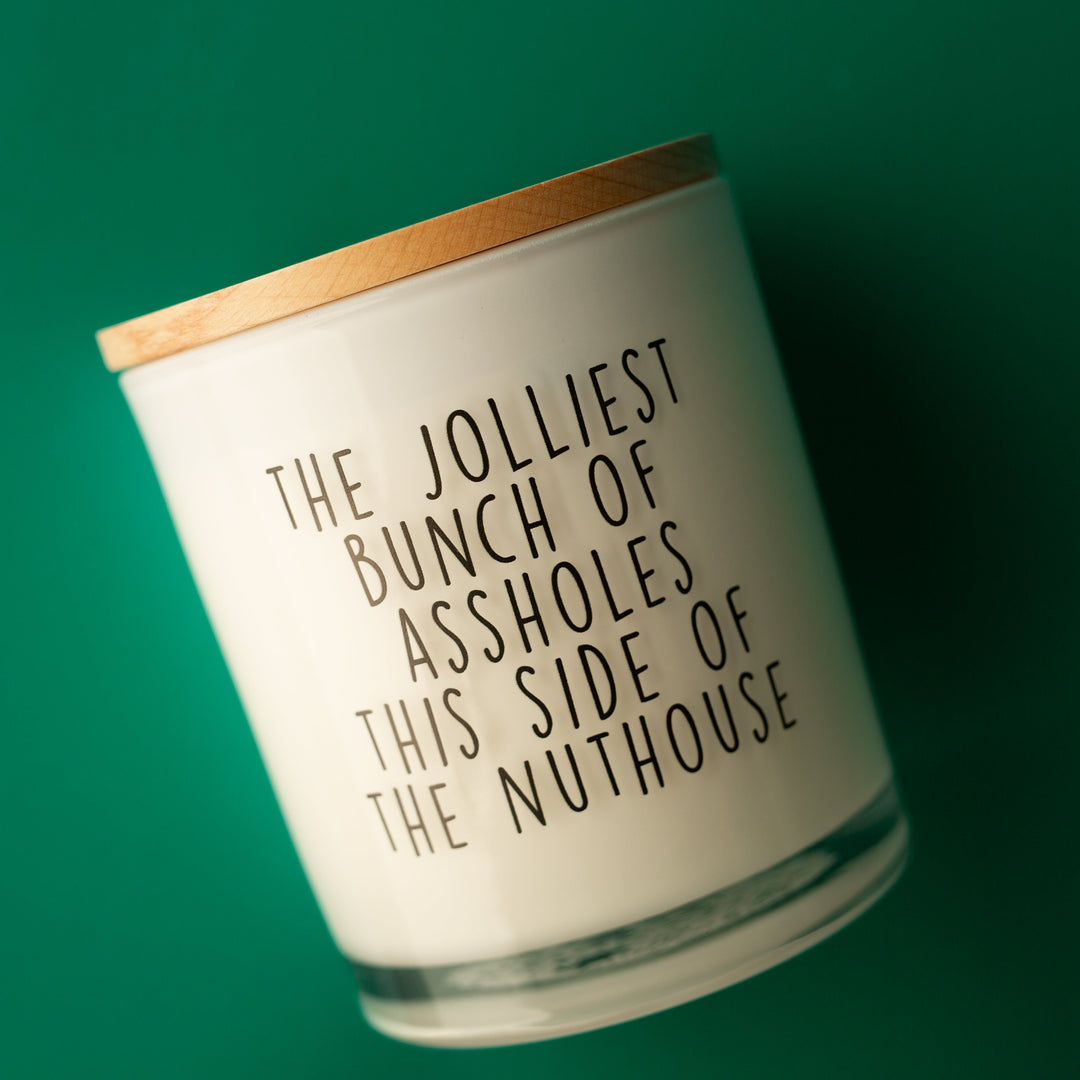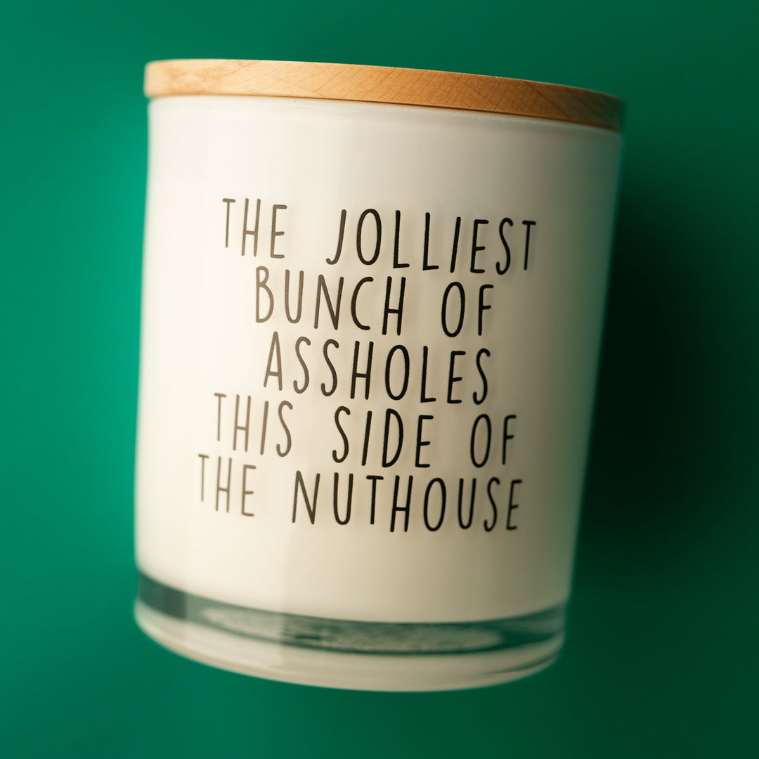 This printed candle was inspired by the famous Christmas movie, National Lampoon's Christmas Vacation, and reads "THE JOLLIEST BUNCH OF ASSHOLES THIS SIDE OF THE NUTHOUSE". This printed candle will have your family laughing all season long.