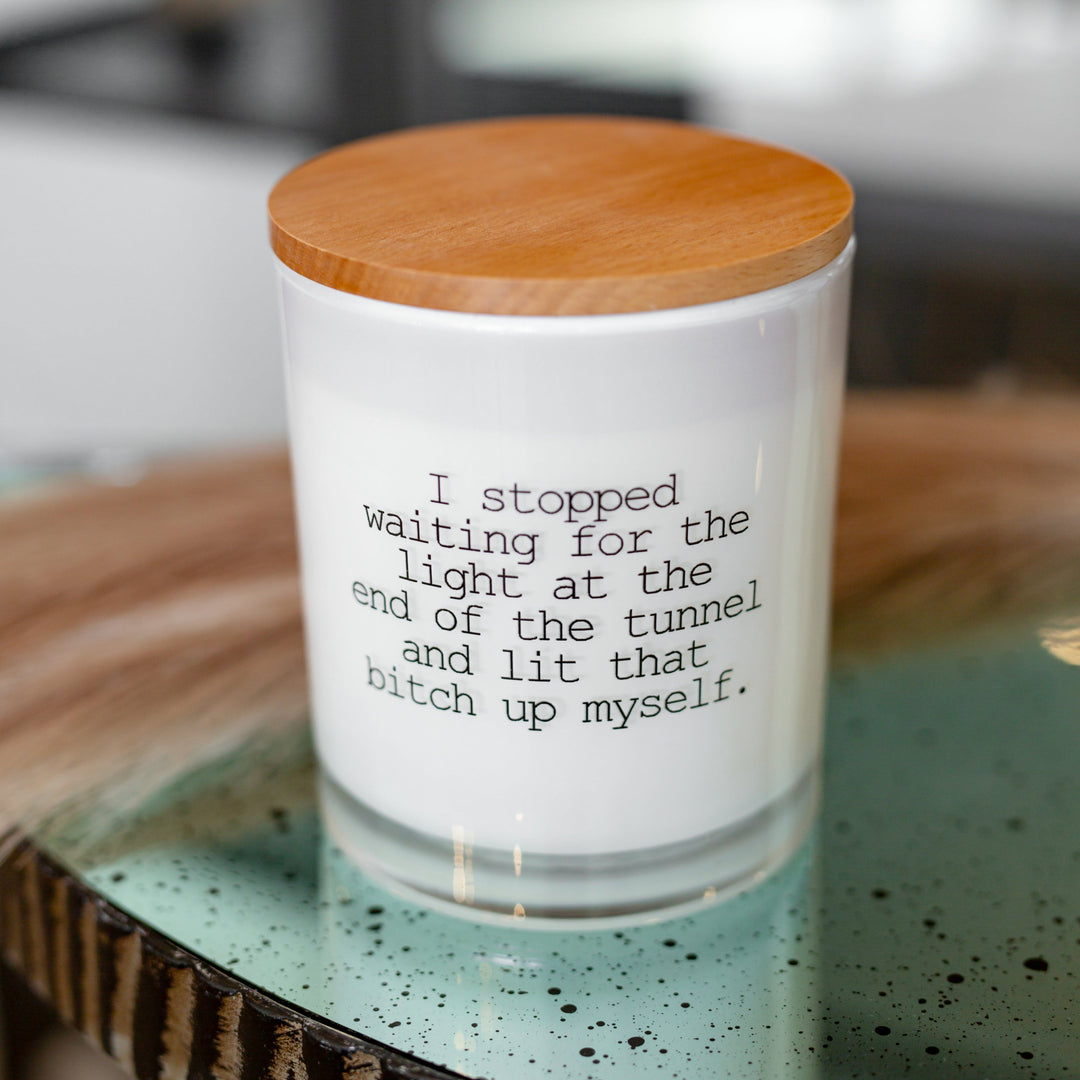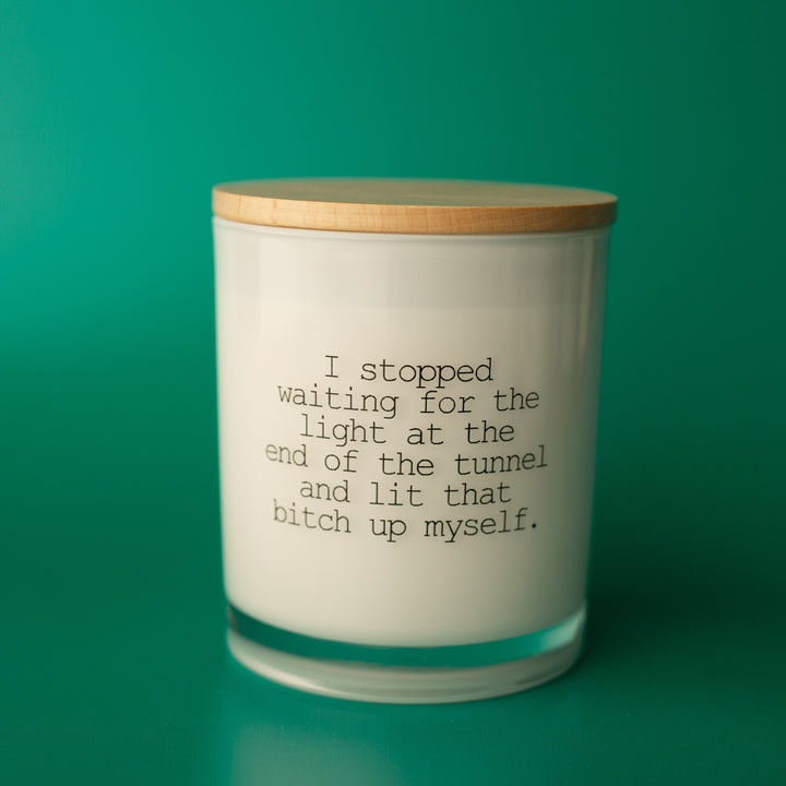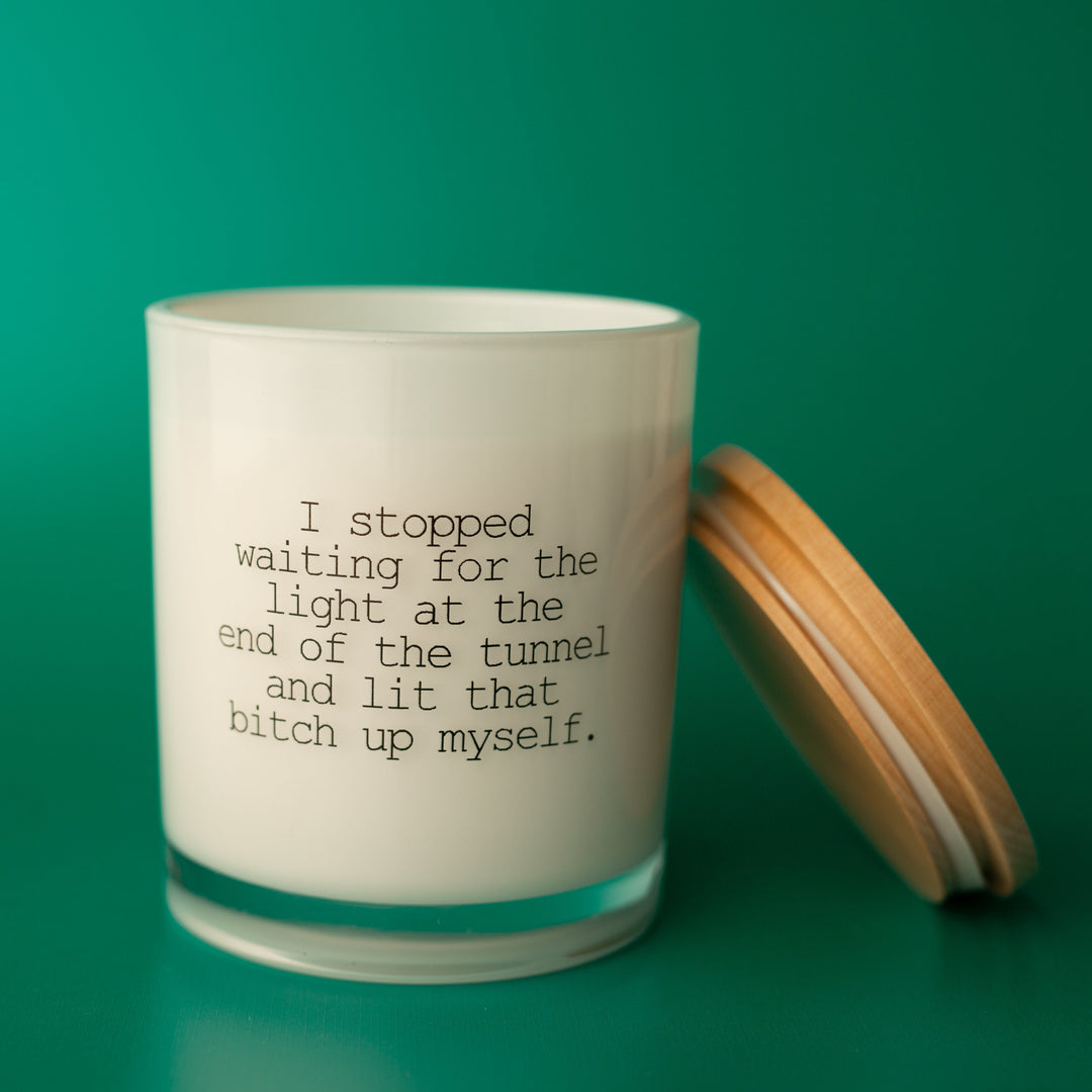 This legendary candle will have the entire room laughing. This printed candle reads "I stopped waiting for the light at the end of the tunnel and lit that b**** up myself." This printed candle is perfect for any or all "go-getters".