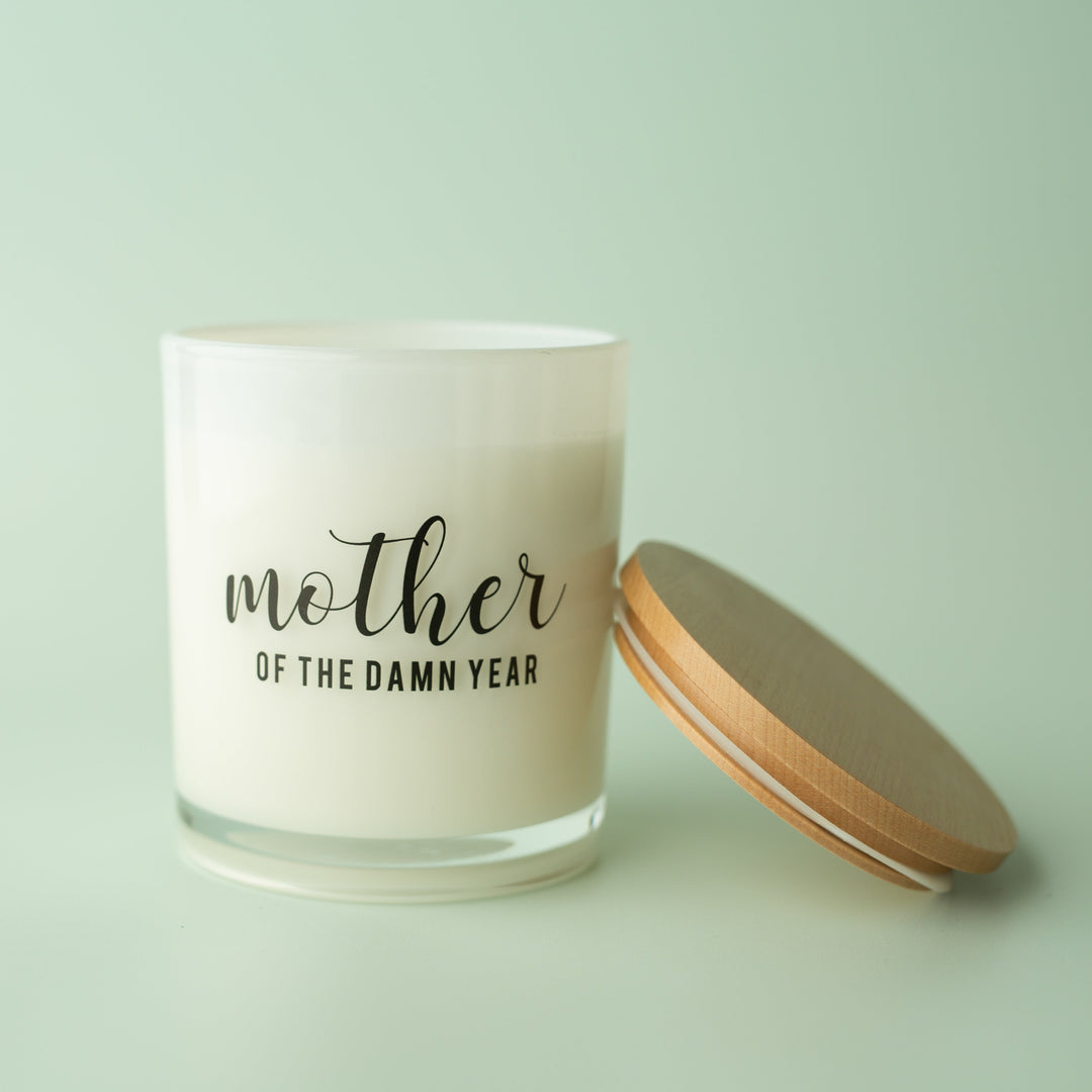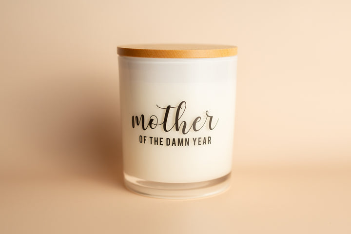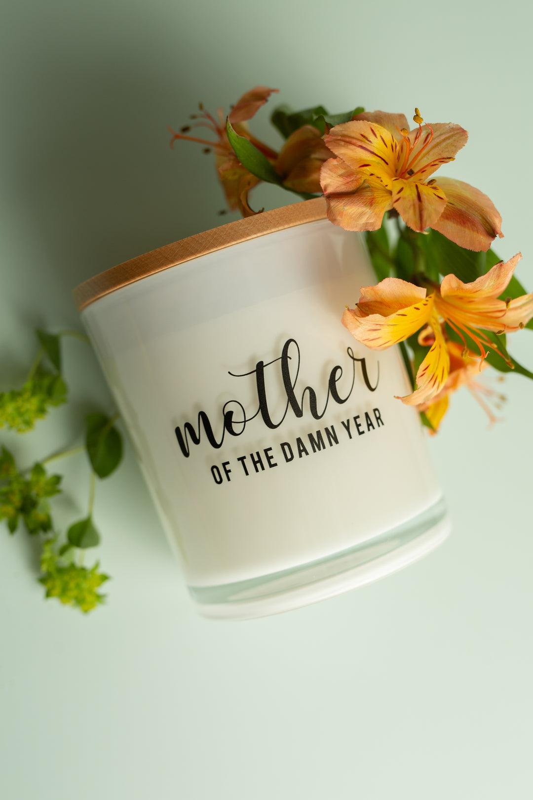 This featured print is one of our year-round top-sellers! This print reads "Mother of the damn year". Gift this candle to all the moms of the year.