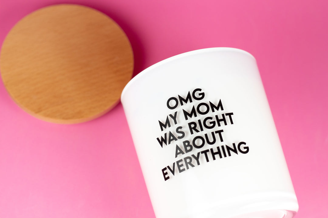 This printed candle reads "OMG my mom was right about everything". Moms know best, it's true. Gift this to the mom that always seemed wrong at the moment, but always ended up being right in the end.
