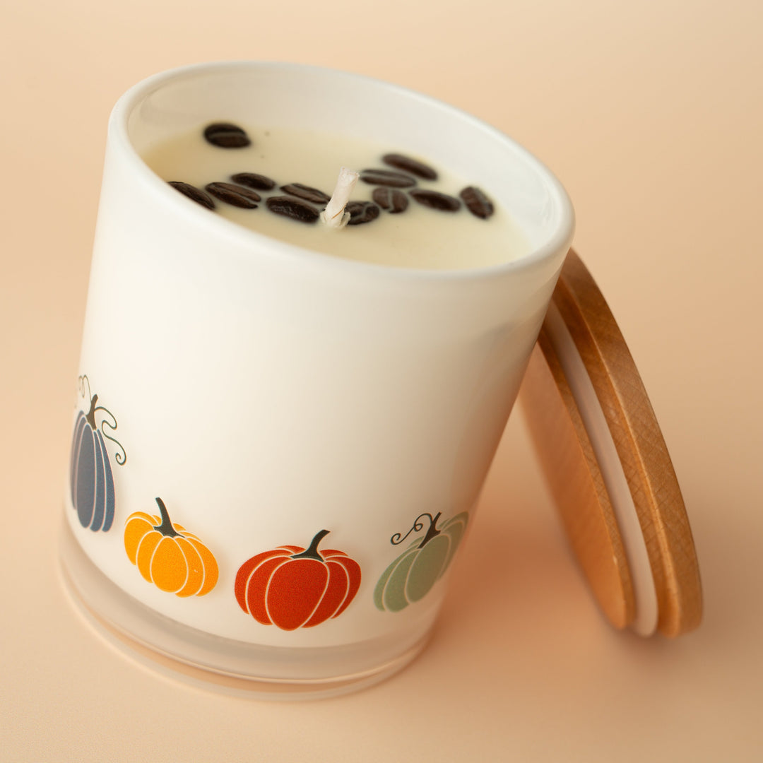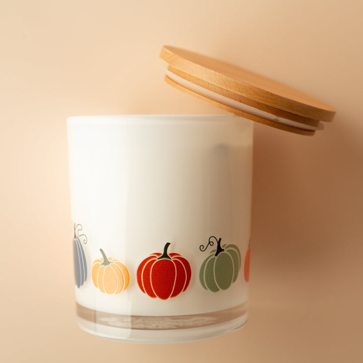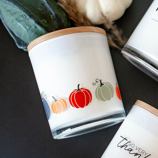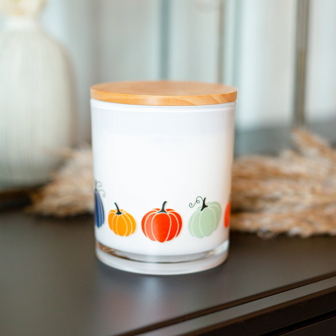 This printed candle features pumpkins in unique dusty colors wrapped all the way around.