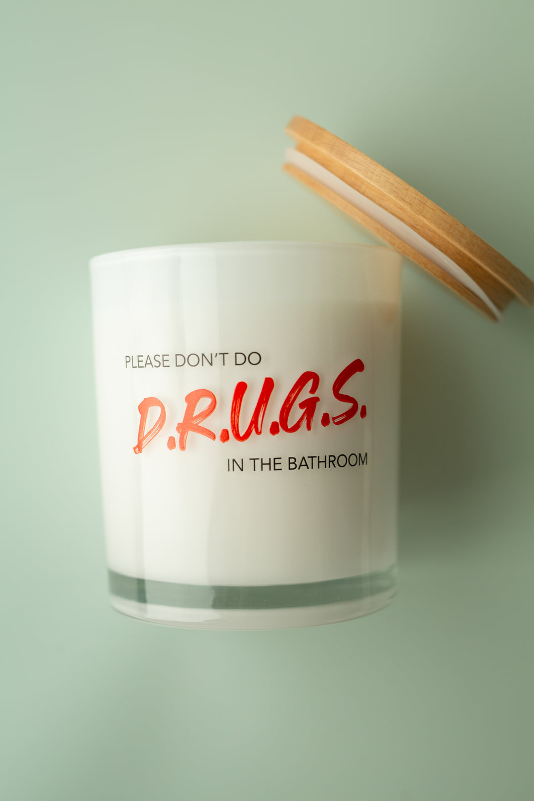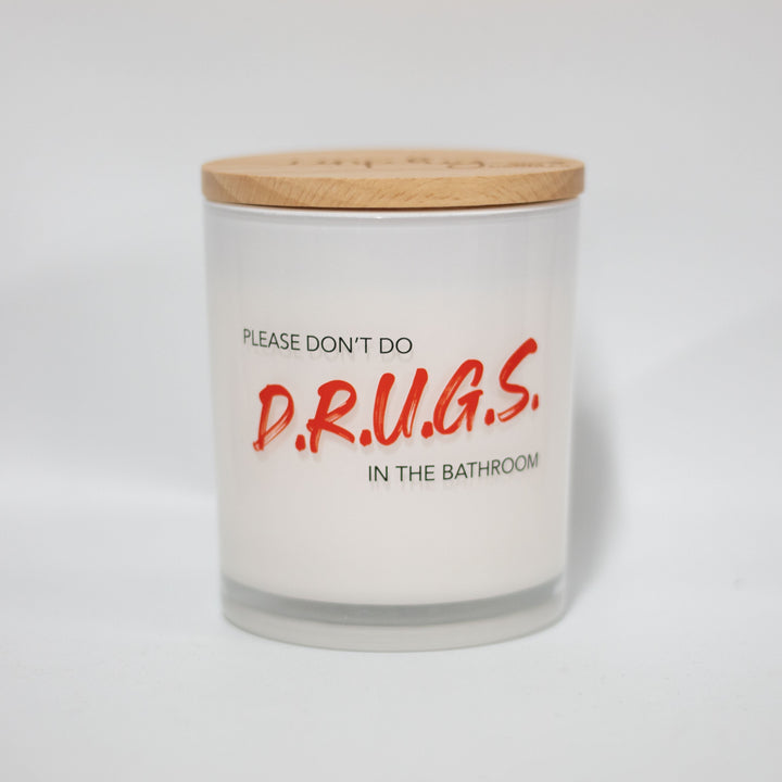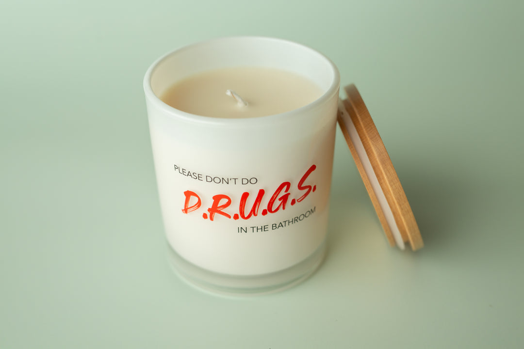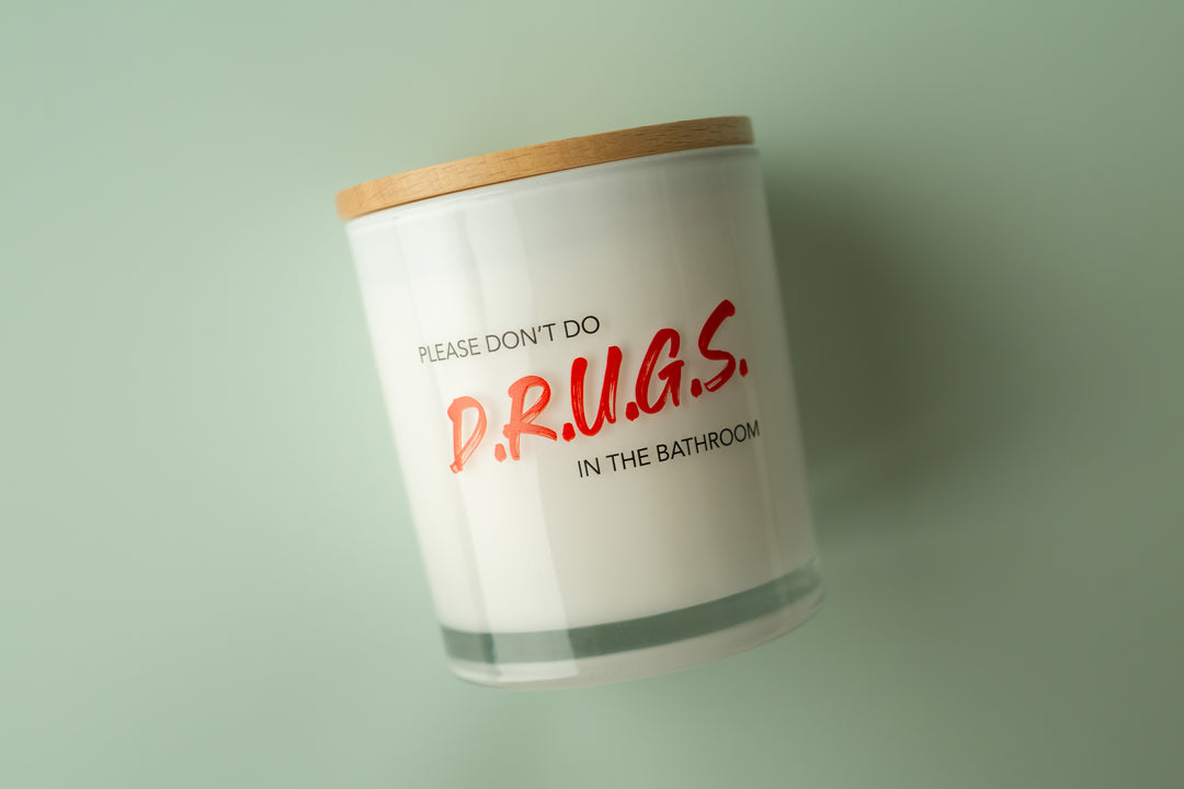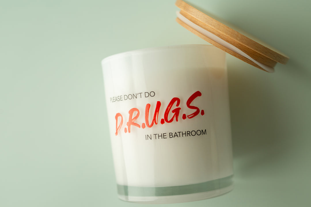 This printed candles reads "Please don't do drugs in the bathroom" in fun fonts. Bring some laughter into your bathroom with this candle!