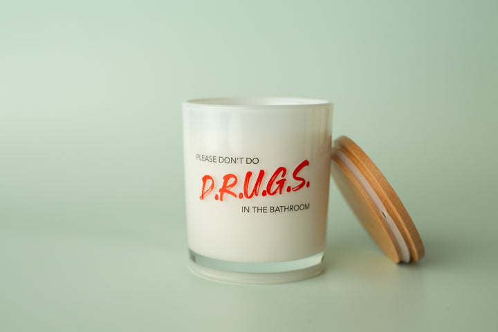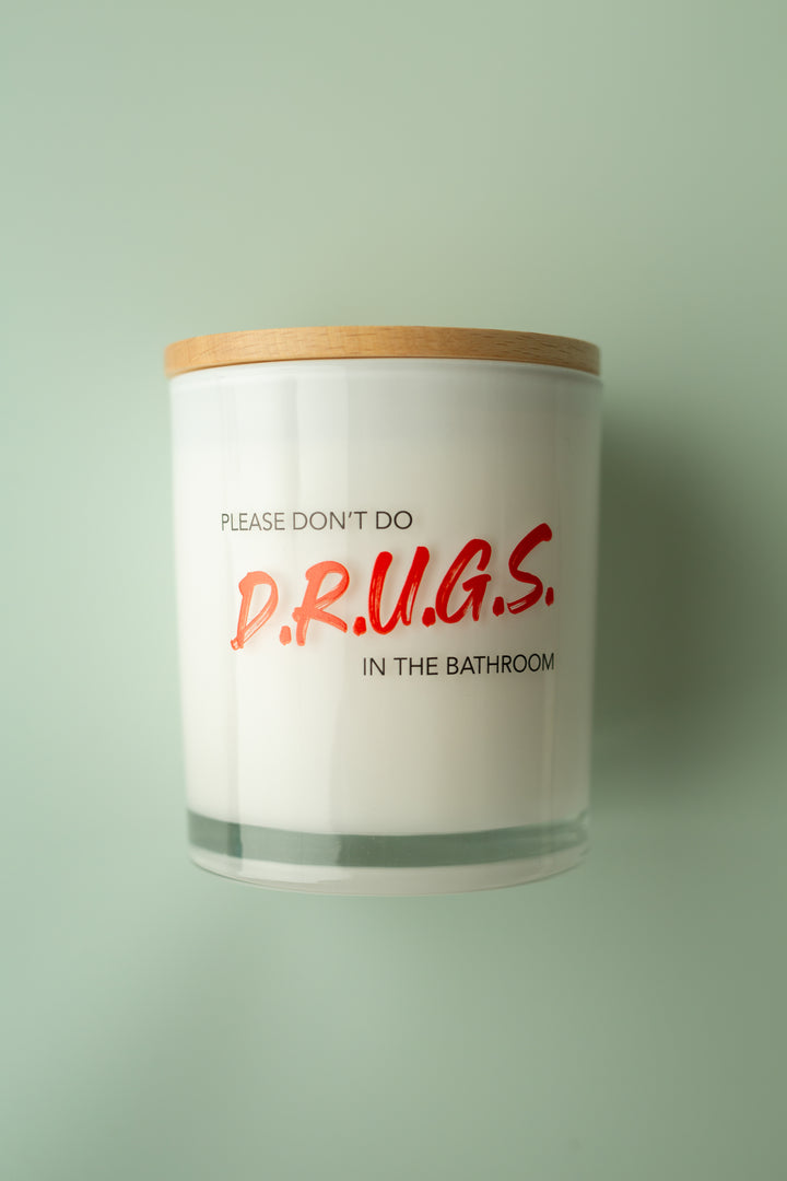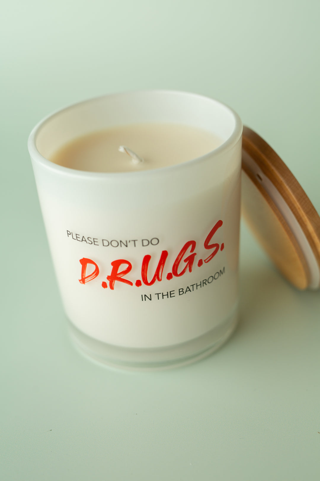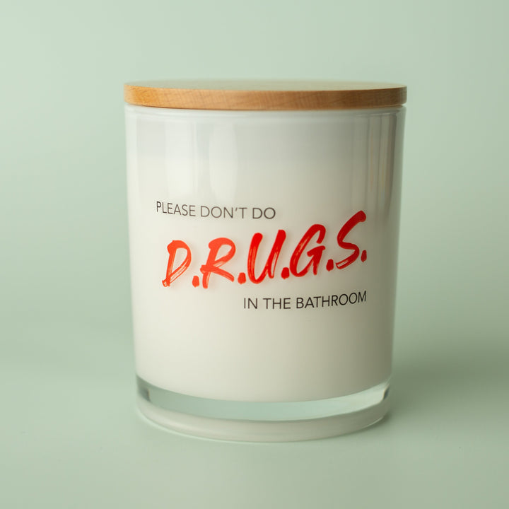 This printed candles reads "Please don't do drugs in the bathroom" in fun fonts. Bring some laughter into your bathroom with this candle!