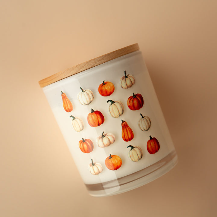 Indulge in the warm and cozy ambiance of our pumpkin collage candle. Its unique design will fill your home with the essence of fall.