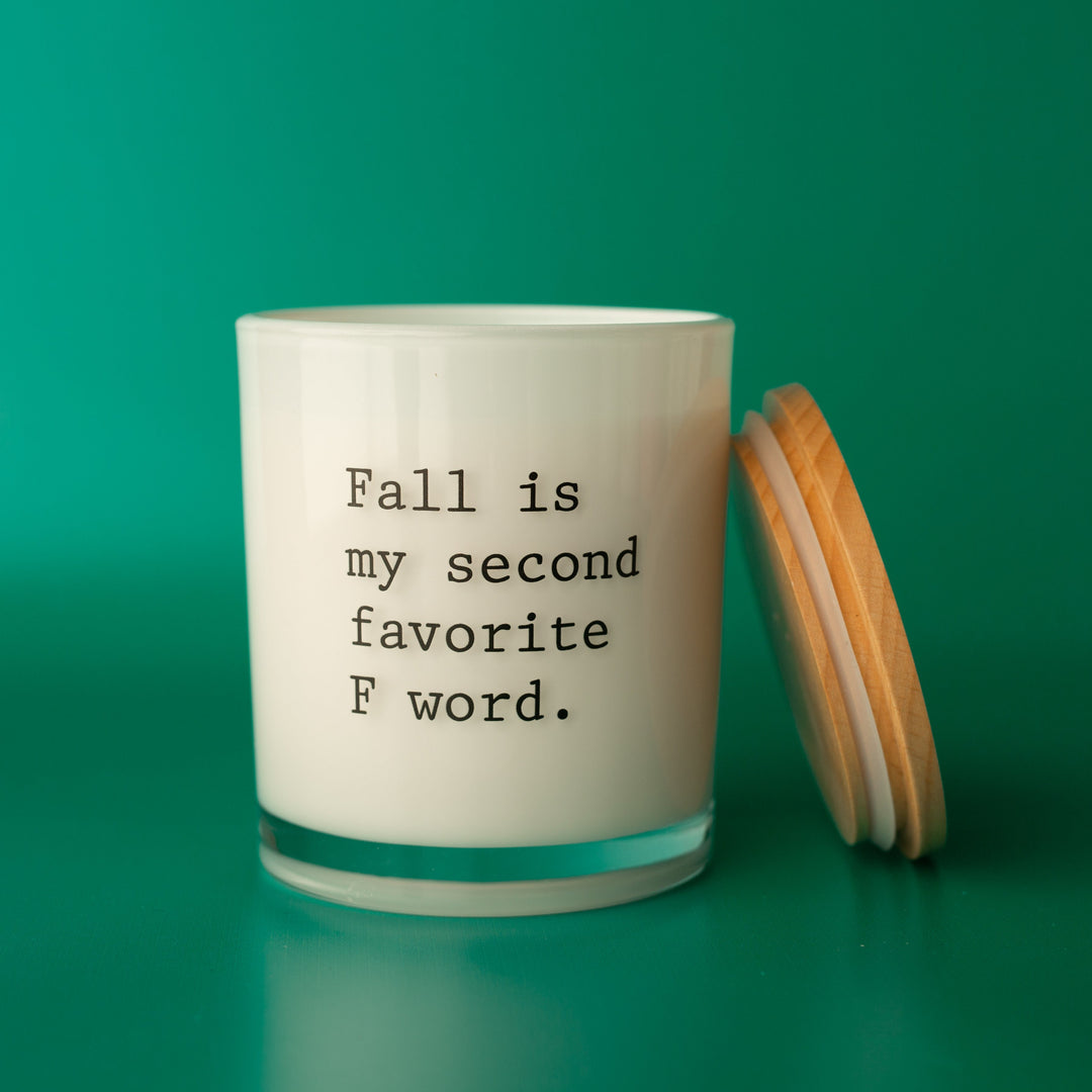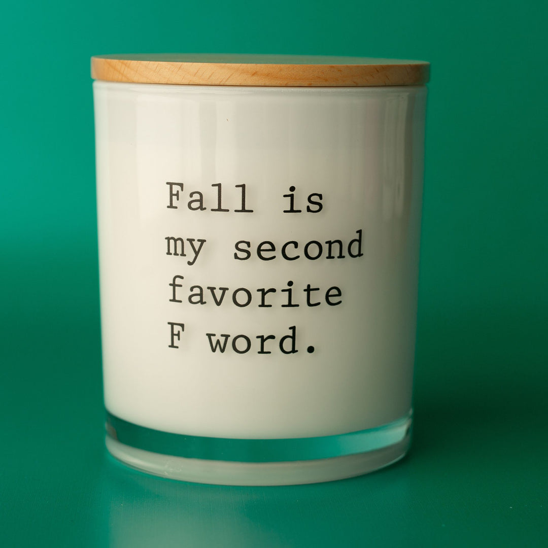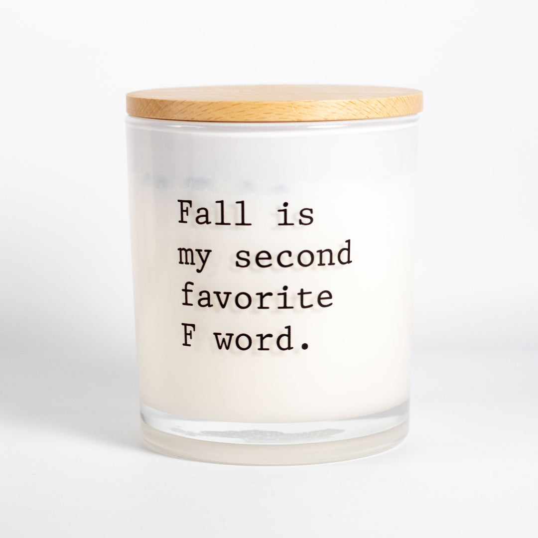This printed candle reads "fall is my second favorite f word". This candle makes for a perfect conversation starter.