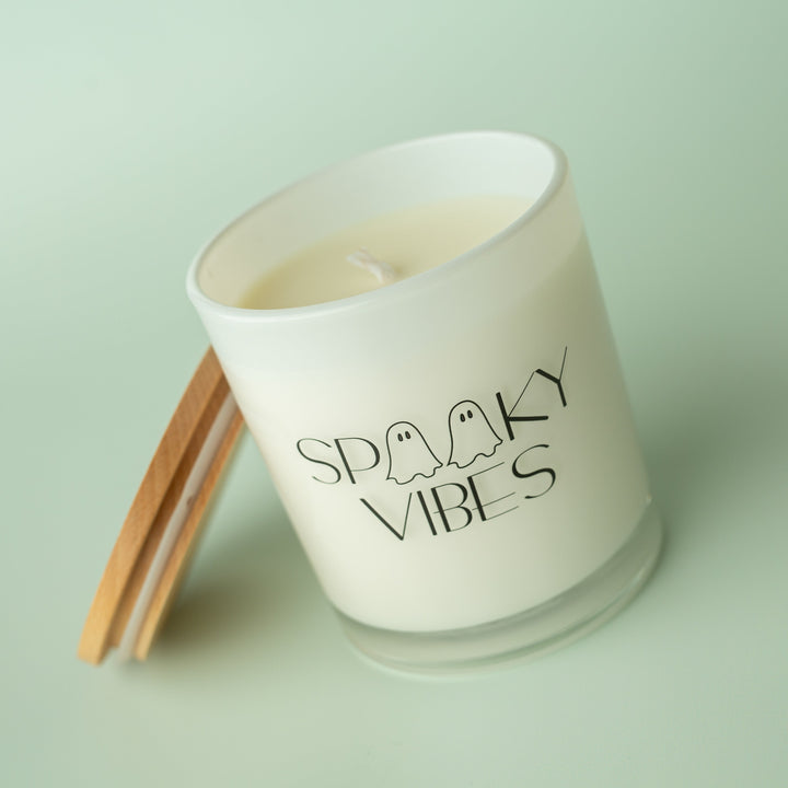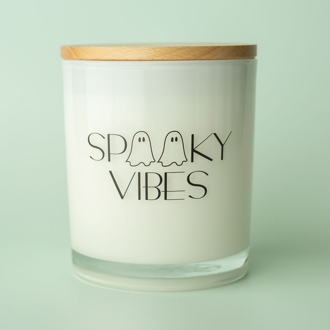 This printed candle reads "SPOOKY VIBES". Experience the eerie ambiance of Halloween with our Spooky Vibes Printed Candle.
