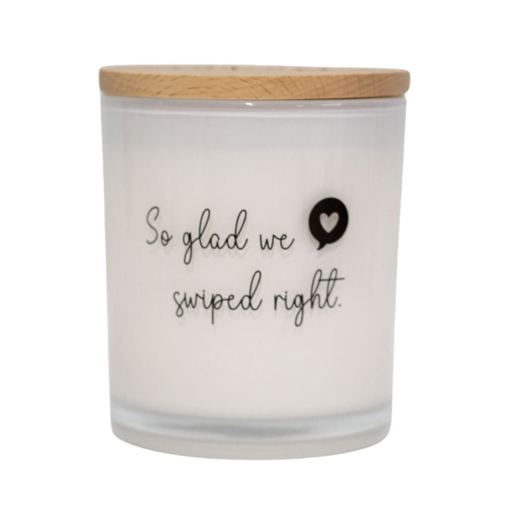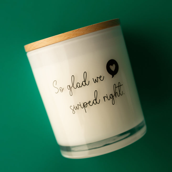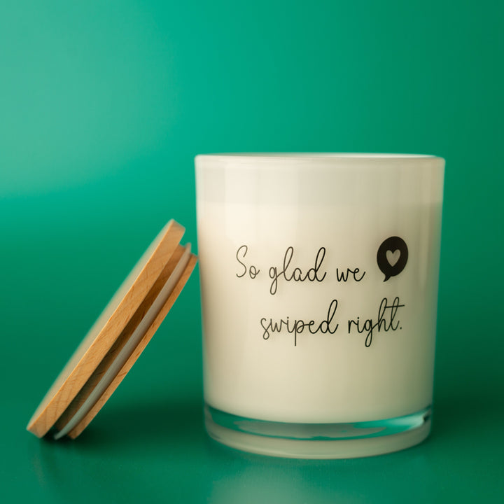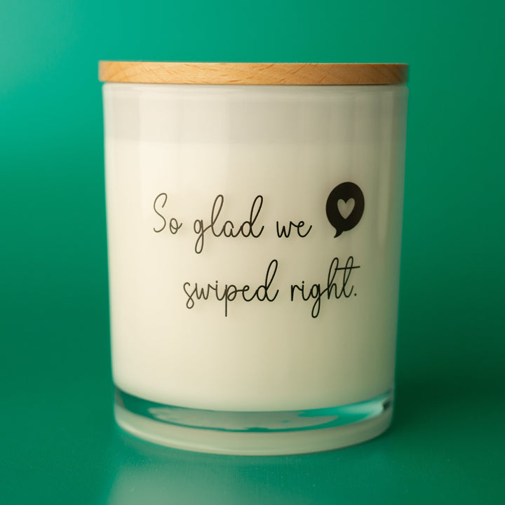 This printed candle reads "So glad we swiped right". This featured print is sweet, simple and perfect for any occasion but especially for Valentine's Day. Gift this to that special someone you 'swiped right' on.