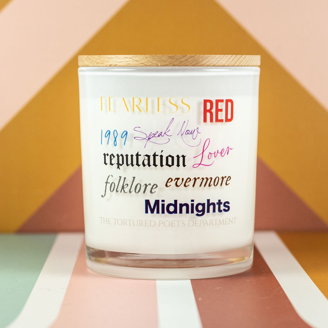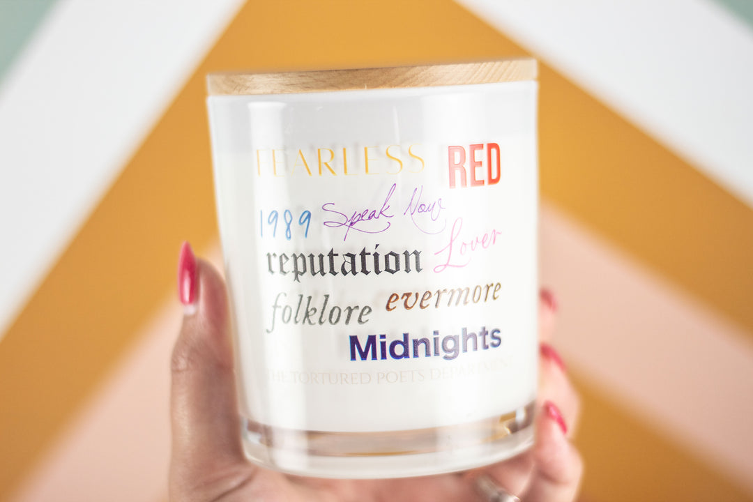 Introducing our Taylor Swift Albums Soy Candle, featuring Taylor's iconic album names. Perfect for Swifties, it's a delightful tribute to Taylor's musical legacy.