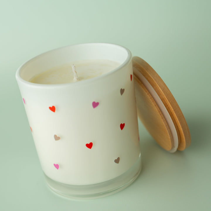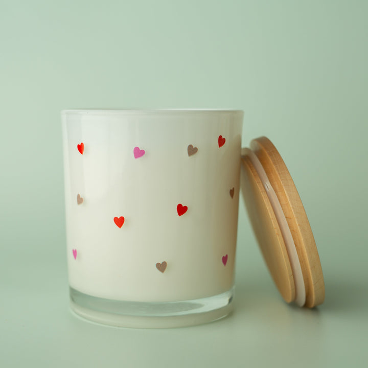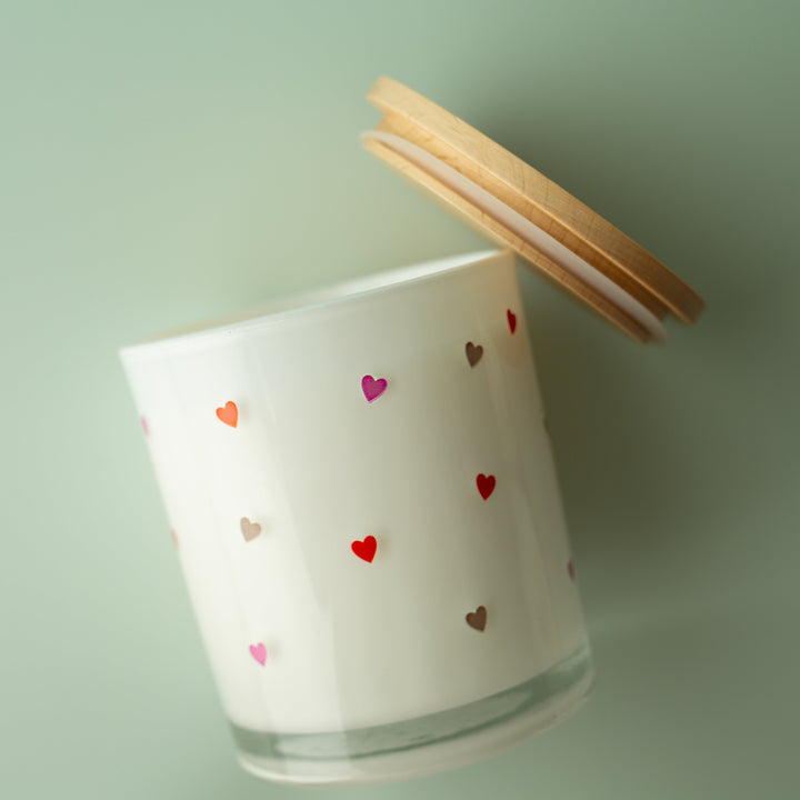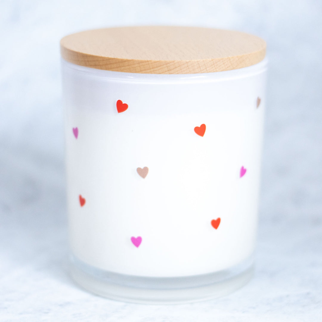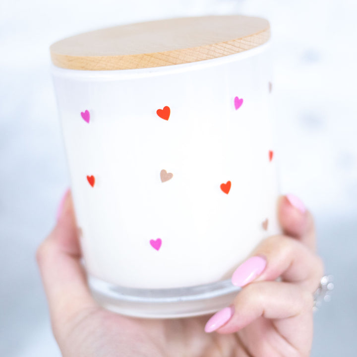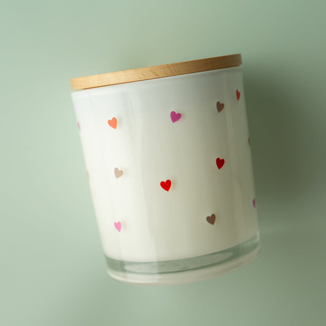 The sweetest candle to celebrate Valentine's Day! This dainty design features tiny hearts in tan, pink and red wrapped all the way around the candle.