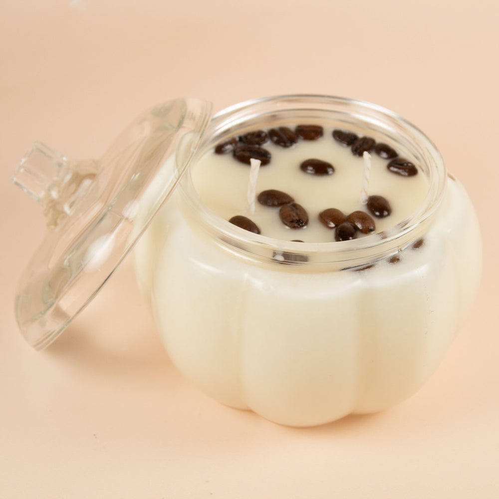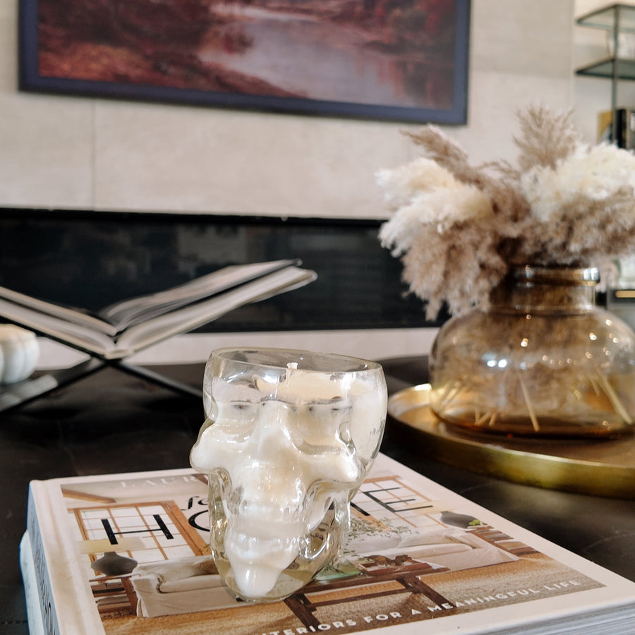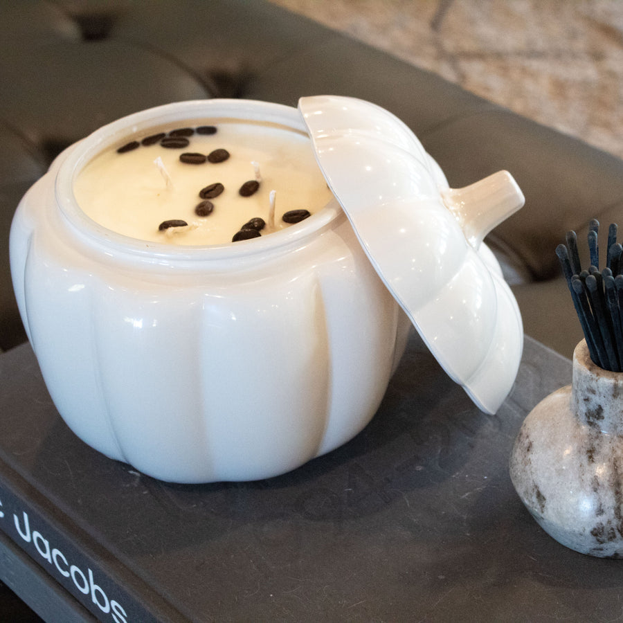 Decorative items including a vase with dried pampas grass and a white pumpkin-shaped candle on a gold tray.