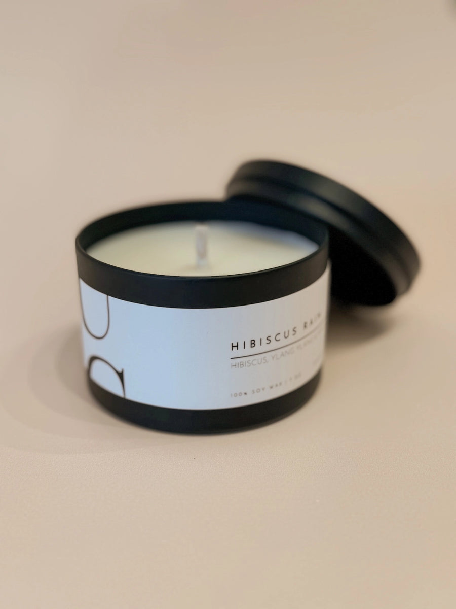 A gold tin candle with the lid off, placed on a book, with a blurred background featuring decorative items.